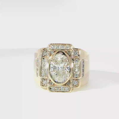 Crafted in solid 14K yellow gold, this luxurious men’s statement ring features a bold 3.0 carat oval-cut lab grown diamond at its center, framed by sparkling natural side diamonds for a total diamond weight of 3.4 carats. Its wide band and geometric design add a powerful, sophisticated presence.