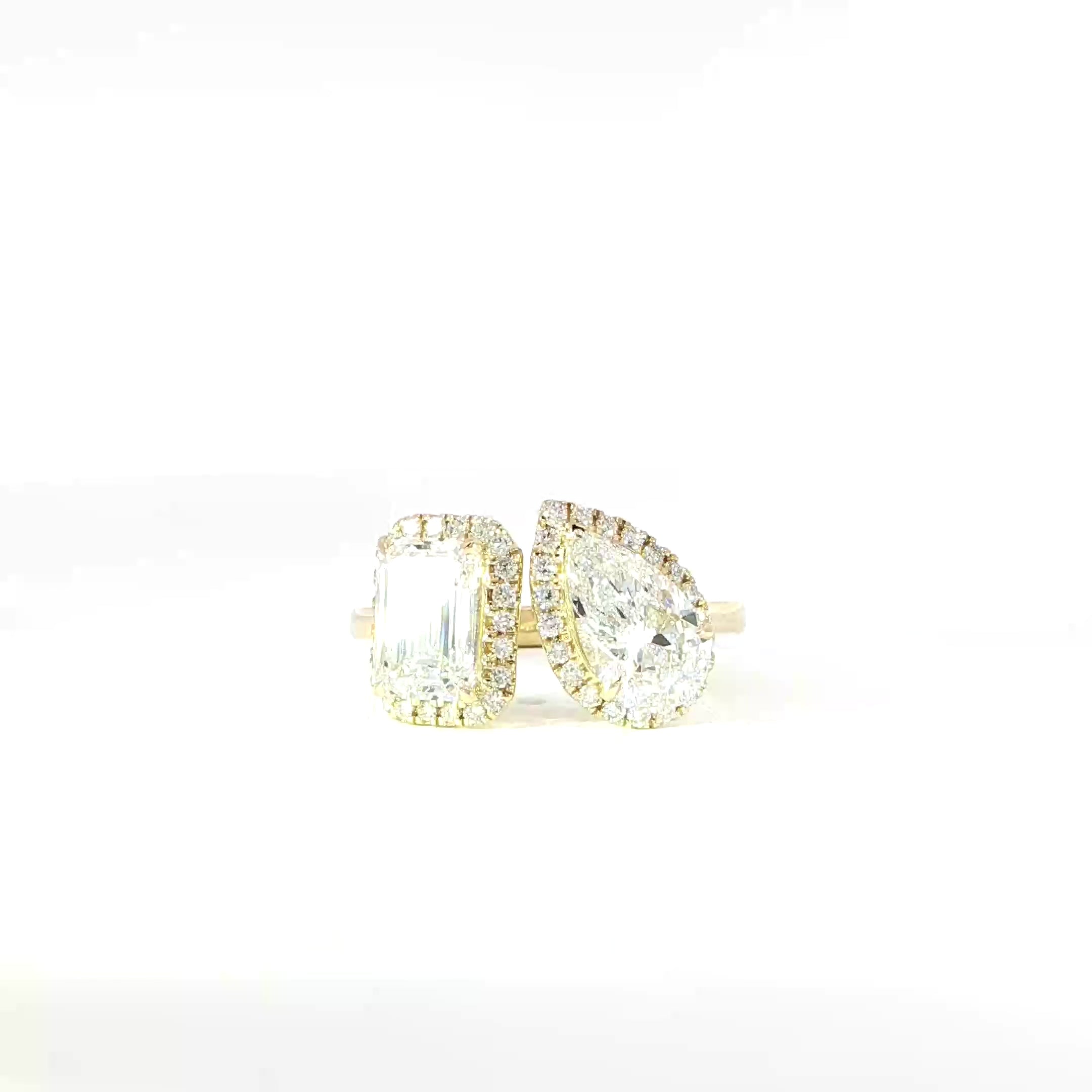 A striking symbol of harmony and love — this 14K yellow gold Toi et Moi ring features two certified lab grown diamonds, one radiant emerald-cut and one pear-shaped, each surrounded by a halo of brilliant accent diamonds. Together, they create a modern and luxurious statement of unity and elegance.