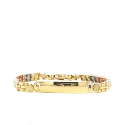 This elegant 14K solid gold ID bracelet features a sleek 5MM width, 6-inch length, and a tri-color gold design for timeless appeal. A stylish choice with room for a personalized engraving.