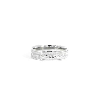 This 14K white gold band features a sleek engraved design that adds depth and character to its classic shape. Perfect as a wedding band or everyday statement piece, it combines durability with timeless elegance.