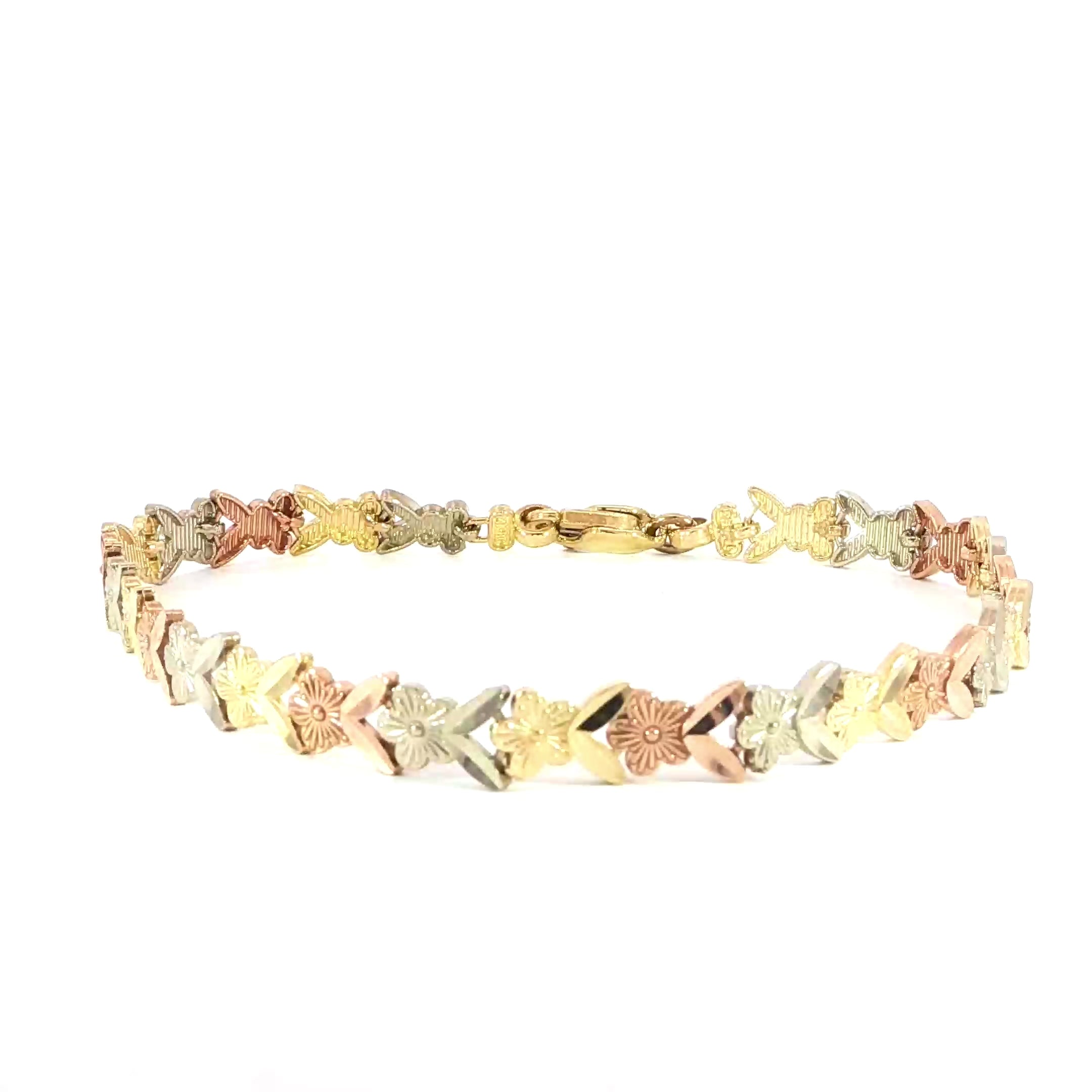 Add elegance to your collection with this 14K three color gold bracelet featuring a unique flower chevron pattern. The blend of white, yellow, and rose gold offers timeless beauty.
