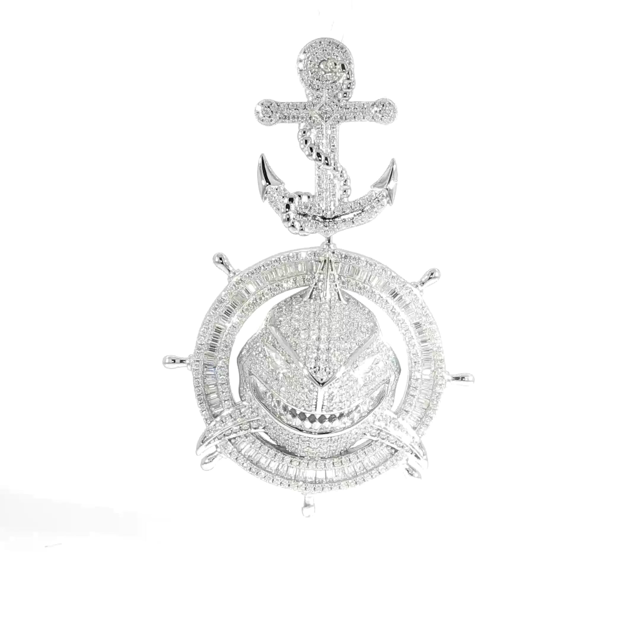 A bold and striking piece, this pendant combines an anchor and shark design with intricate moissanite detailing for maximum brilliance. Crafted in high-polish sterling silver, this statement pendant represents power and precision — perfect for anyone with a fearless style.