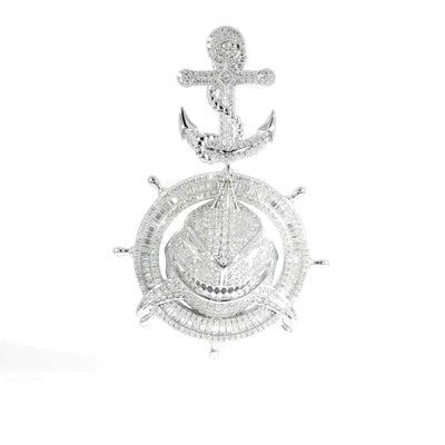 Sterling Silver 45mm Iced Anchor & Shark Pendant with Moissanite Stones