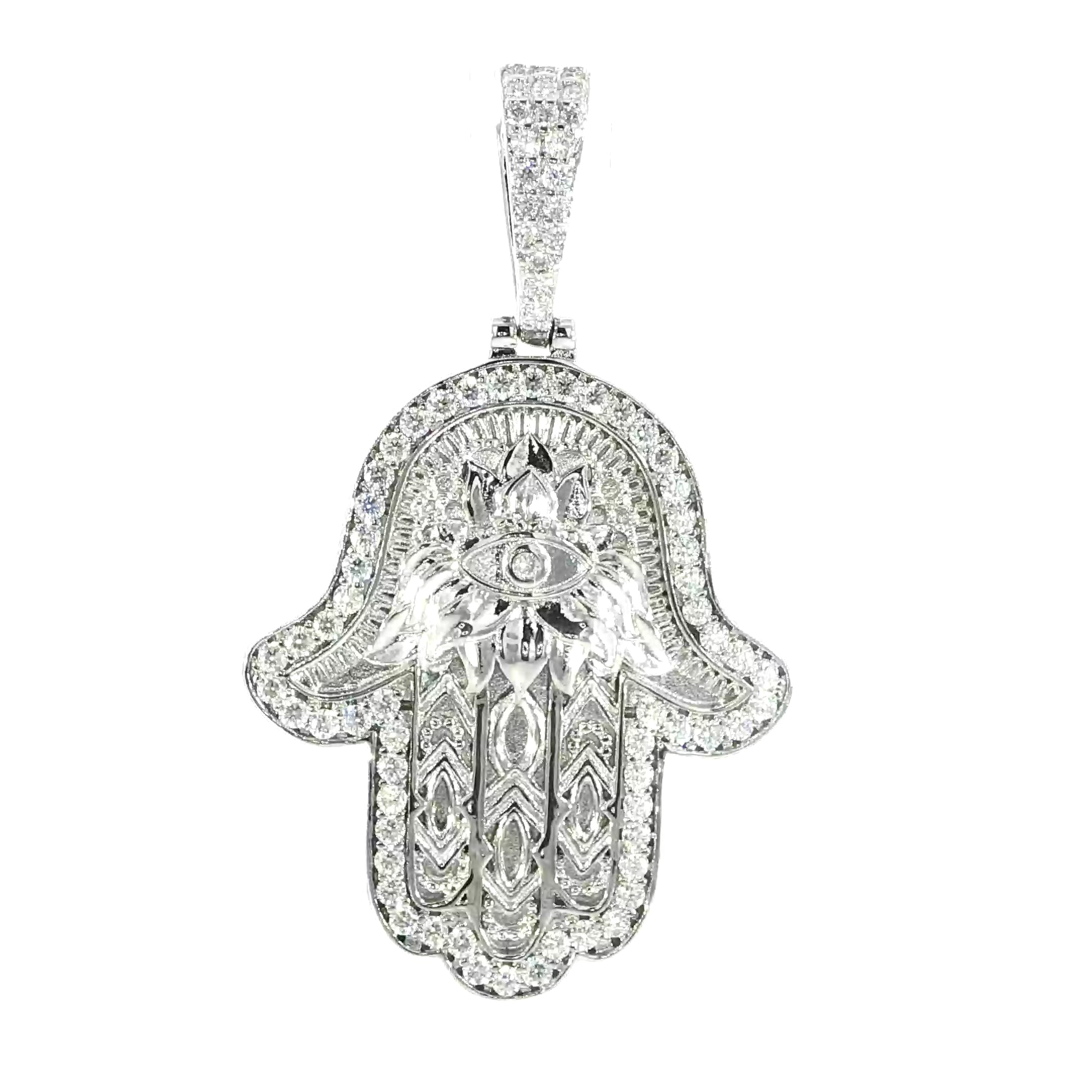 Sterling Silver Hamsa Hand Pendant/Charm with VVS Moissanite Stones, 1.17 Total Carats